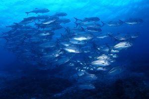 中層にはギンガメアジが元気に群れています